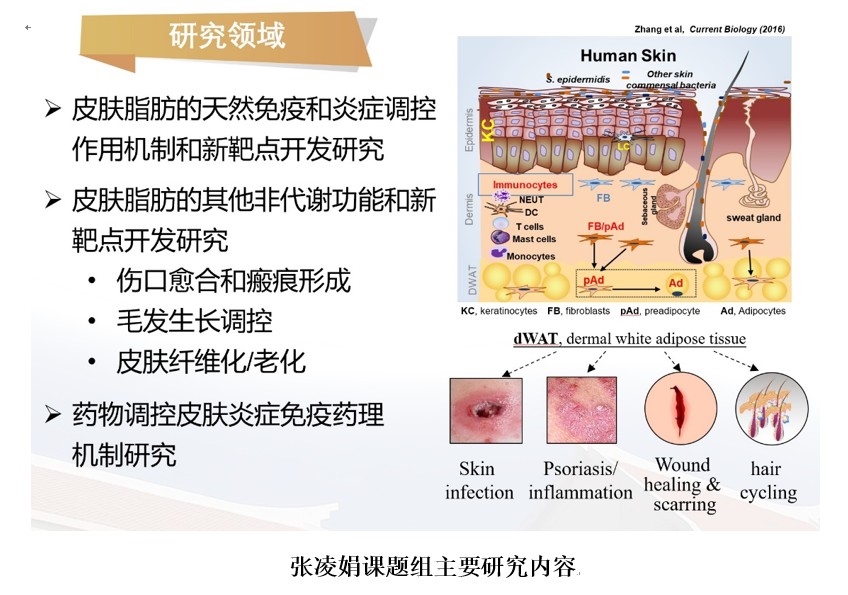 张凌娟博士有近15年海外(美国)药理学/皮肤医学领域科研经历,在皮肤天然免疫功能和调控机制研究领域开展了一系列独创性的研究工作,发现dsRNA-MAVS通路在上皮角质形成细胞参与损伤诱发银屑病炎症的天然免疫机制 (Immunity, 2016);还开创性地发现皮肤中的脂肪谱系细胞 (Preadipocytes/Adipocytes) 有免疫抑菌功能,可通过大量释放多肽抗生素来抵御细菌感染(Science, 2015),这一过程被定义为reactive adipogenesis (JID, 2019);近年来还阐述了在衰老 (Immunity, 2019) 和饮食诱发肥胖 (Sci. Transl. Med., 2021) 过程中真皮脂肪丢失抗菌功能的机制和潜在新靶点,并进一步揭示了真皮脂肪在发育和伤口愈合过程中可塑性变化的分子调控机制 (Cell Reports, 2023);共发表学术论著或论文40多篇,总引用3000多个,单篇最高他引800多个,多次受邀在国际学术会议上做学术报告。学术兼职包括SCI期刊EXP DERMATOL副主编; SEMIN CELL DEV BIOL客座主编;中国免疫学会皮肤免疫分会、中华医学会皮肤性病学分会实验学组、中华中医药学会免疫学分会、厦门市医学会转化医学分会等学会的常务委员。自2018年加入厦门大学永利618官网,紧密围绕真皮脂肪谱系细胞参与维持皮肤稳态、调控皮肤免疫系统、伤口愈合、纤维化、毛发生长等过程开展新机制和新靶点研究,为多种皮肤病,包括炎症性皮肤病、慢性伤口、瘢痕、雄激素性脱发等提供新病理机制和药物研发靶点,拟在永利618官网组建以皮肤病免疫调控为靶点策略的全新药物研发平台,利用原代细胞库、3D皮肤模型等前沿手段,与厦大附属医院相关科室开展的临床转化研究合作,促进科研成果应用于临床。