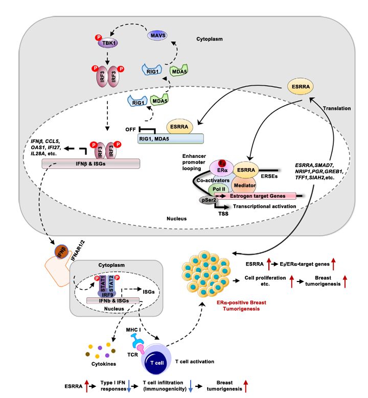 ESRRA作为转录因子,在细胞代谢、线粒体生物合成等过程中发挥核心作用,并与包括癌症在内的多种疾病相关。然而,其对转录程序的具体调控机制尚不完全清楚。本研究阐明,在雌激素刺激下,ESRRA与ERα共同被招募至超级增强子区域,以相互依赖的方式协同激活ERα靶基因的转录。另一方面,ESRRA直接结合到胞浆RNA传感器RIG-I和MDA5的启动子区域,抑制其表达,进而削弱I型干扰素信号通路及下游基因激活,最终抑制了抗肿瘤免疫反应。
