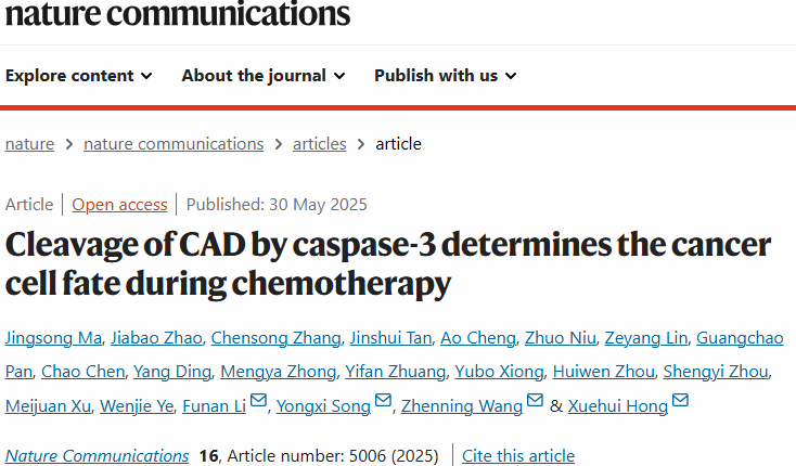 近日,福建省药物新靶点研究重点实验室、厦门大学永利618官网李福男团队,联合厦门大学附属中山医院洪雪辉、中国医科大学王振宁、宋永喜团队,成功开发出小分子RMY-186可通过靶向CAD-Asp1371突变有效改善化疗疗效。相关研究成果以“Cleavage of CAD by caspase-3 determines the cancer cell fate during chemotherapy”为题发表于 Nature Communications期刊。