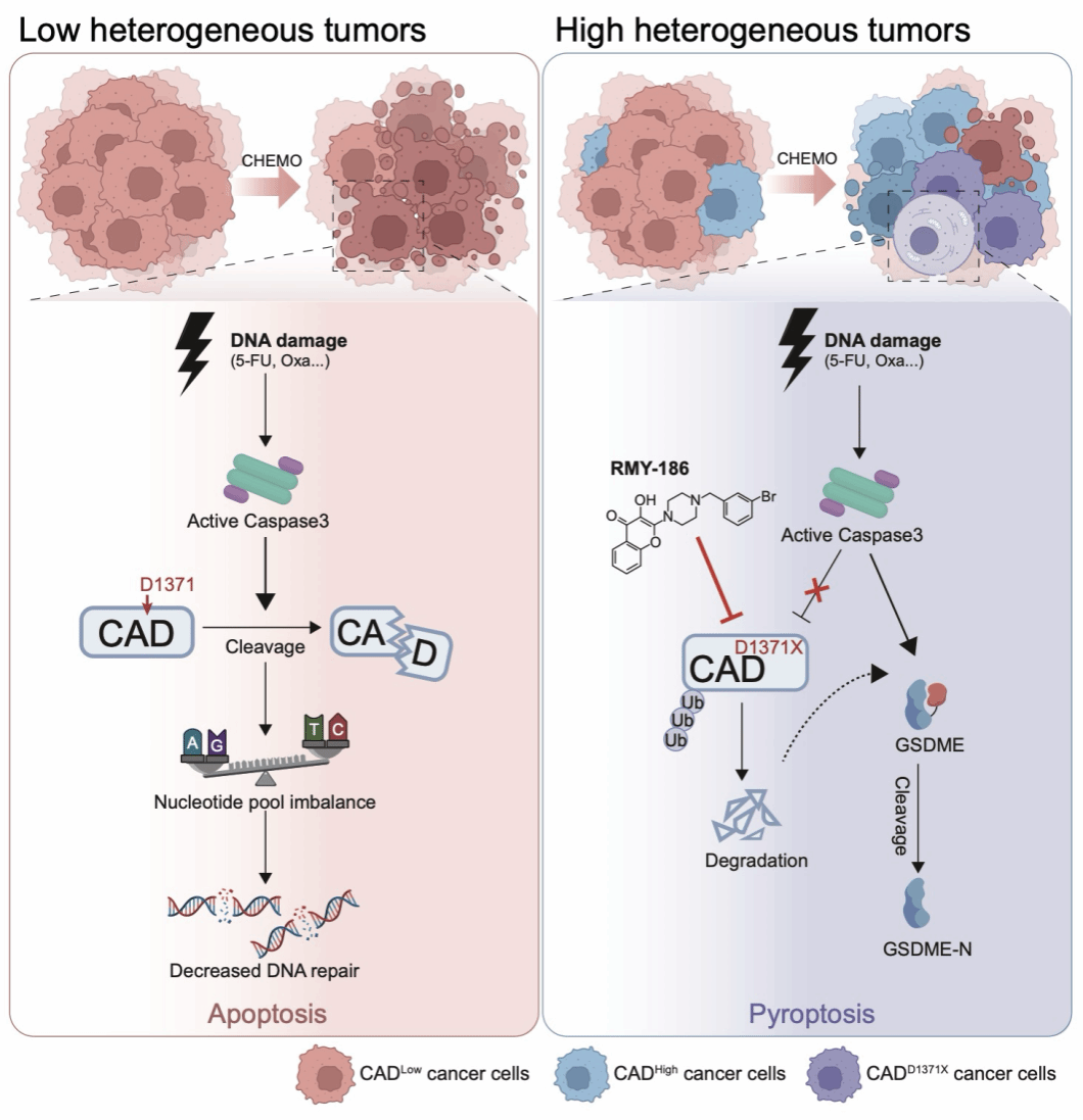团队研究发现嘧啶核苷酸从头合成途径限速酶酶CAD(二氢羟化酶)在第1371位天冬氨酸(Asp1371)被化疗激活的caspase-3特异性切割导致其表达下降,进而诱导肿瘤细胞凋亡;高表达水平或者具有切割抗性(如Asp 1371突变)的CAD因其不被充分切割降解,能够维持肿瘤细胞内嘧啶核苷酸的正常供给,在化疗抵抗中发挥关键作用。在新辅助化疗失败的肿瘤样本中发现了与CAD-Asp1371相关的突变,使用RMY-186靶向CAD-Asp1371突变可改善化疗疗效。研究工作揭示了在化疗过程中从头合成嘧啶的脆弱性,提示CAD可能成为有前景的治疗靶点和潜在的生物标志物,强调了靶向降解CAD及其Asp1371突变体的小分子抑制剂RMY-186在逆转化疗抵抗方面具有良好的临床应用前景。