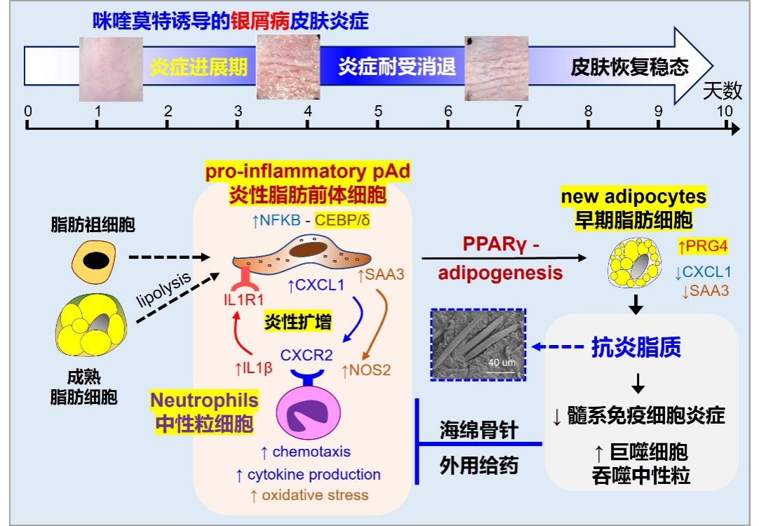 银屑病,作为一种慢性炎症性皮肤病,给全球约 2%-3% 的人口带来了长期困扰。中性粒细胞的过度浸润是银屑病的关键特征之一,然而其背后的调控机制却一直笼罩在迷雾之中。张凌娟教授团队历经多年深入研究,首次系统揭示了真皮白色脂肪组织(dWAT)在银屑病发生发展过程中独特的“双阶段动态调控”机制。团队研究发现,在炎症爆发初期,真皮脂肪前体细胞(PDGFRA+ pAds)迅速响应,通过分泌 CXCL1 等趋化因子,大肆招募并激活中性粒细胞,点燃炎症的“熊熊烈火”,形成促炎正反馈环路,加剧银屑病症状。然而,随着炎症的发展,局势悄然逆转,持续的 IL1β 信号宛如一位“幕后指挥家”,通过精准调控 NFκB-C/EBPδ-PPARγ 信号轴,促使脂肪前体细胞华丽转身,分化为早期脂肪细胞(eAd)。这些新生的早期脂肪细胞随即释放抗炎脂质介质,不仅有效抑制中性粒细胞和巨噬细胞的炎症反应,还助力巨噬细胞清理中性粒细胞,推动炎症走向自发耐受与消退,实现了炎症的“急刹车”。