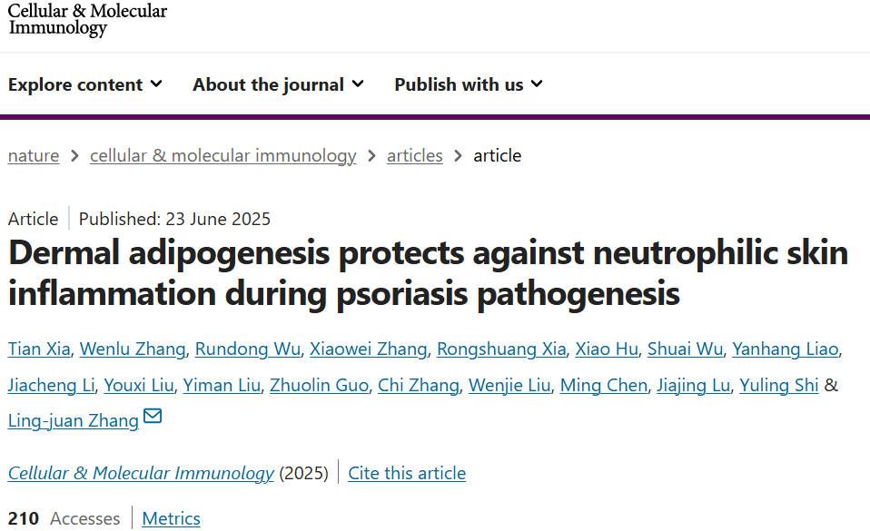这一研究不仅从创新视角重新定义了真皮脂肪在皮肤炎症中的角色,还为银屑病等中性粒细胞驱动的炎症疾病研究开辟了崭新的路径,提供了独特的思路,展现出显著的潜在临床转化价值。谈及未来研究方向,张凌娟教授表示:“我们将进一步挖掘早期脂肪细胞分泌的特异性抗炎脂质,加速探索其在慢性炎症性疾病临床应用中的无限可能,全力以赴为众多银屑病患者研发出更具成效的治疗方案。”