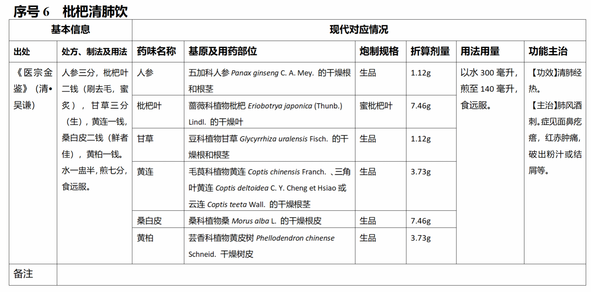 本次获批的“枇杷清肺饮颗粒”的原方剂“枇杷清肺饮”出自清代名医吴谦的《医宗金鉴》,由蜜枇杷叶、桑白皮、黄连、黄柏、人参、甘草六味中药组成,具有清肺经热的功效,是治疗肺风酒刺的名家要方。临床多用于治疗面鼻疙瘩、红赤肿痛、破出粉汁或结屑等。“枇杷清肺饮”是国家中医药管理局发布的《古代经典名方目录(第一批)》中的第94方以及《古代经典名方关键信息表(7首方剂)》中的第6方,从信息公布之日起其相应新药产品开发就在行业内受到高度关注。