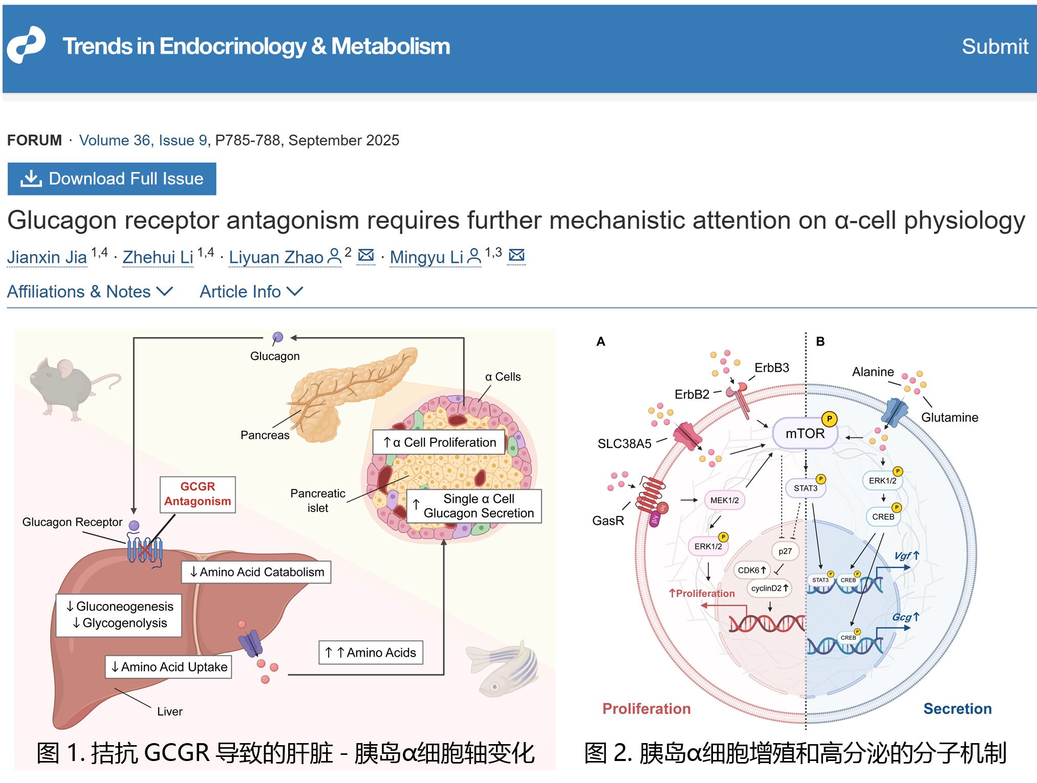 2025年9月9日,厦门大学永利618官网李明玉教授团队受邀在Cell Press旗下内分泌代谢领域期刊Trends in Endocrinology &Metabolism杂志上发表题为“Glucagon receptor antagonism requires further mechanistic attention on α-cell physiology”的论坛综述,论文系统总结了李明玉教授团队及国际同行近年在由胰高血糖素受体(GCGR)信号通路介导的肝脏-胰岛α细胞轴的研究进展,梳理了GCGR拮抗剂与α细胞代谢之间的关系,以及GCGR拮抗剂在糖尿病治疗领域的研究现状与面临的挑战,并在此基础上展望了未来的研究方向。
