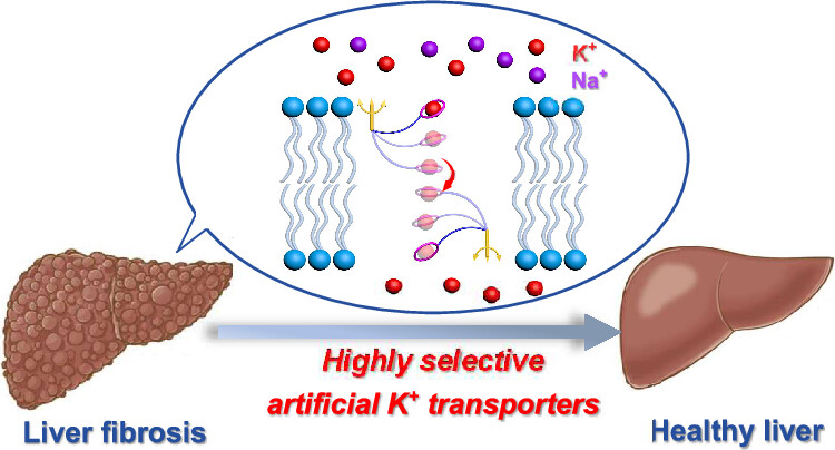 Liver fibrosis is a life-threatening disease that currently lacks clinically effective therapeutic agents. Given the close correlation between dysregulated intracellular K+ homeostasis and the progression of liver fibrosis, developing artificial K+ transporters mimicking the essential function of their natural counterparts in regulating intracellular K+ levels might offer an appealing yet unexplored treatment strategy. Here, we present an unconventional class of artificial K+ transporters involving the “motional” collaboration between two K+ transporter molecules. In particular, 6C6 exhibits an impressive EC50 value of 0.28 μM (i.e., 0.28 mol % relative to lipid) toward K+ and an exceptionally high K+/Na+ selectivity of 15.5, representing one of the most selective artificial K+ transporters reported to date. Most importantly, our study demonstrates, for the first time, the potential therapeutic effect of K+-selective artificial ion transporters in reversing liver fibrosis both in vitro and in vivo.